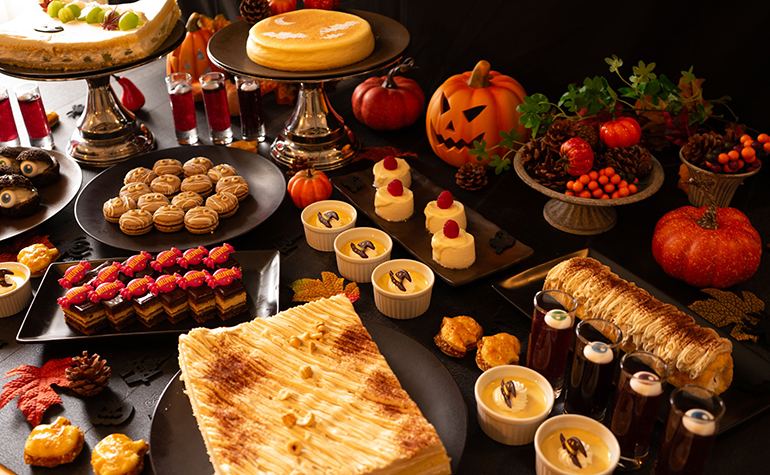 10/18(土)・19(日)・25(土)・26(日)の期間限定で開催されるのは、「ハロウィンスイーツブッフェ」(大人6,000円)。「和栗のショートケーキ」や「魔女のプリン」、「ミイラのマカロン」など、ハロウィンならではの特別なスイーツが食べ放題。パティシエのスペシャルデザートとして「紫芋のモンブラン」も用意。この時期だけのスイーツブッフェでハロウィン気分を堪能してみて。