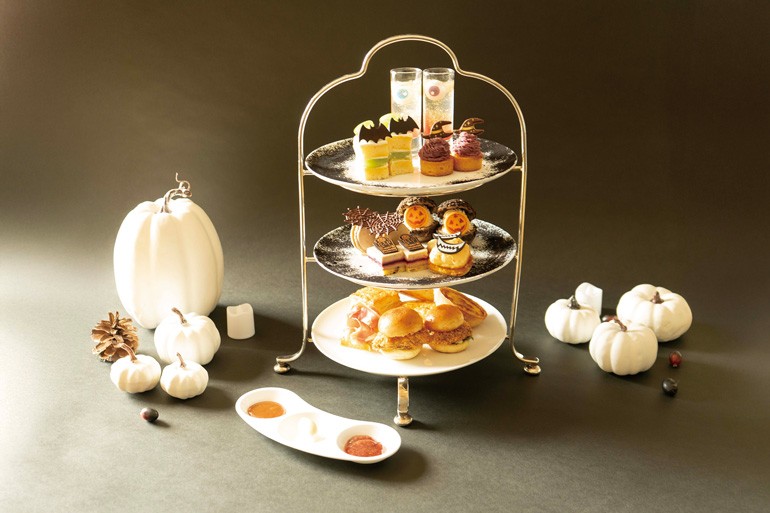 また、10月限定「ハロウィンアフタヌーンティー」(1人5,000円)では、「シャインマスカットのショートケーキ」や「紫芋のモンブランタルト」など、すべてのデザートをハロウィン風にデコレーション。ブラックカカオで不気味さと夜のイメージを演出したアフタヌーンティー。約15種類の飲み物とともに優雅なひとときを。