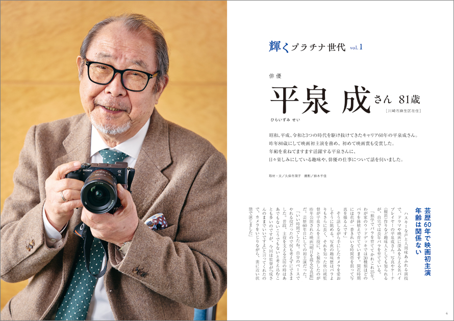 目玉は今号からスタートした「輝くプラチナ世代」。年齢を重ねてますます活躍する、俳優の平泉成さんに独占インタビューを敢行。趣味や仕事についてお話しを伺いました。