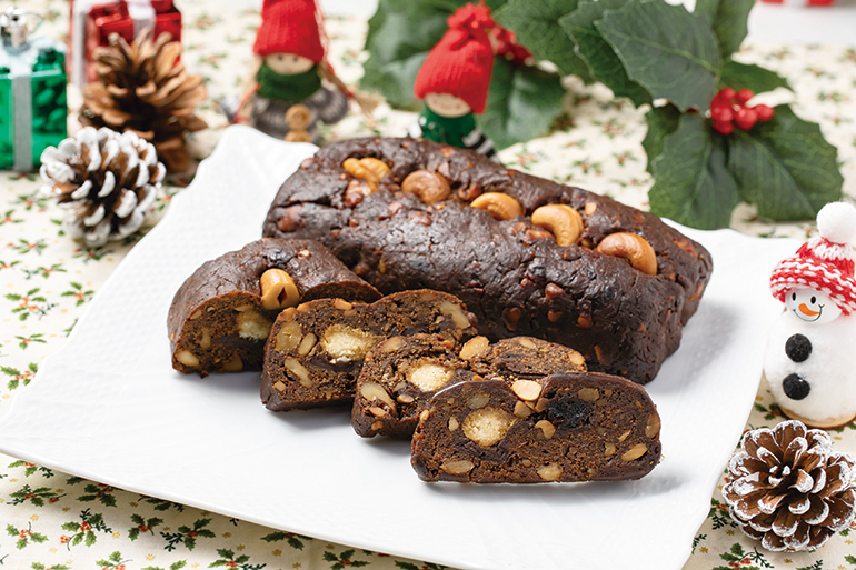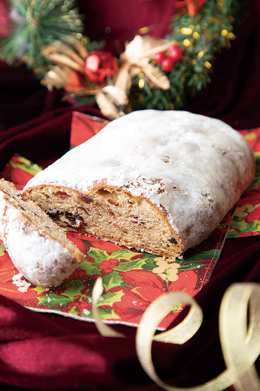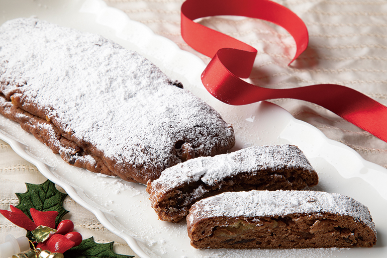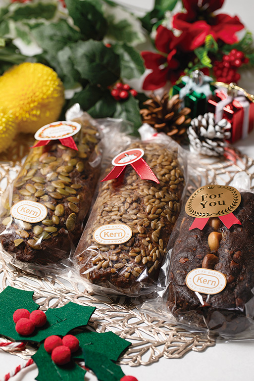 古代小麦を使ったドイツパンが評判のベーカリー「ケルン」では11月下旬から、古代小麦アインコーンとオーガニック小麦を使ったシュトーレンを販売する。アインコーンは抗酸化物質「ルチン」やミネラル、食物繊維などの栄養分が豊富に含まれていることが特長。しっかりとした歯ごたえがあり、小麦本来の甘みと程よい酸味が味わえる。クルミやヒマワリ、パンプキンの種をたっぷりとのせた3種とココア味の計4種。いずれも生地には小麦粉の分量の約4倍のドライフルーツがふんだんに練り込まれ、食べ応えもばつぐんだ。