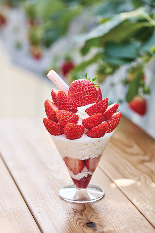 農園内にあるパティスリーには、摘みたての完熟イチゴを使用したスイーツが並ぶ。「いちごパフェ」は甘さ控えめの生クリームとみずみずしいイチゴを組み合わせた。3日かけて作る焼き菓子は、自家製イチゴのピューレやパウダー、素材本来の味を生かしたセミドライイチゴがふんだんに使われ、手土産にもぴったり。イチゴを使ったパフェやケーキは12/27㈯から販売開始。