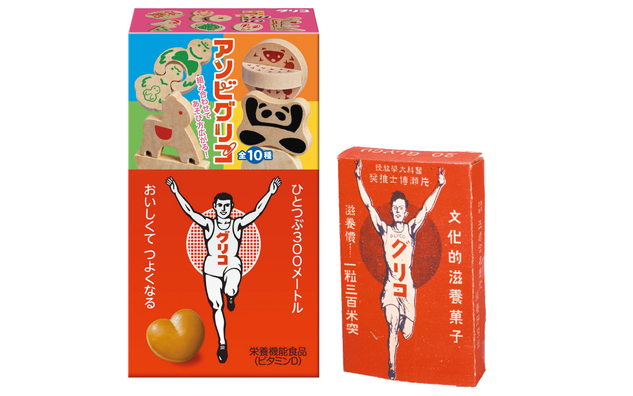 創業者・江崎利一が、グリコーゲンを含むカキエキスを病弱な長男に飲ませたところ、次第に回復。多くの子どもに広める方法として、グリコーゲン入りの栄養菓子を考案した。おもちゃ付きが登場したのは、昭和2(1927)年。子どもにとって食と遊びが大事と考え、心の発育に役立つおもちゃをセットにした。