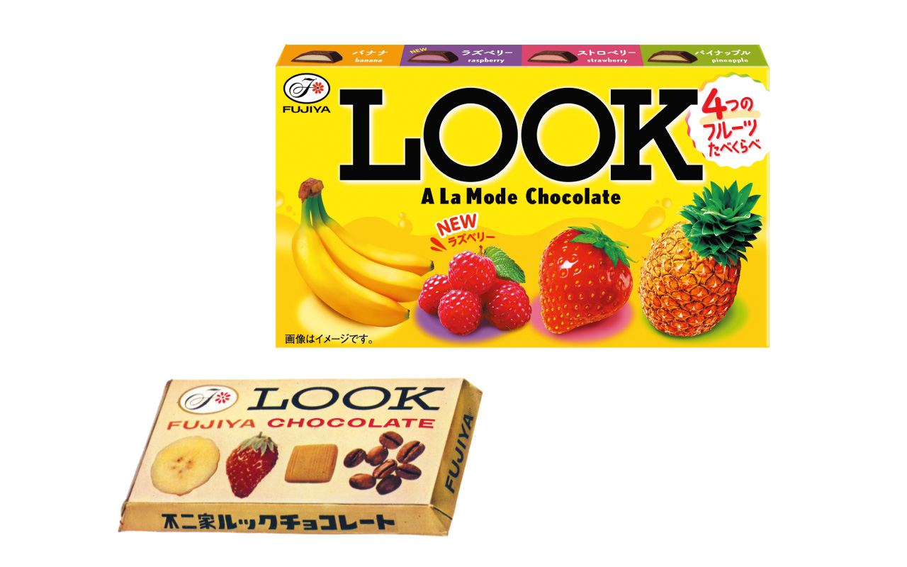 板チョコが主流だった時代に開発された粒チョコ。発売当初はすべての粒がつながった板状で、4種類の味を1列ごとに楽しめた。当時、複数のフレーバーを一箱に詰め込むアイデアは画期的で人気に。商品名は1960年代に流行していたマリンルックやペアルックなどのファッション用語に由来し、「LOOK」のロゴはパリ出身のデザイナーが制作。