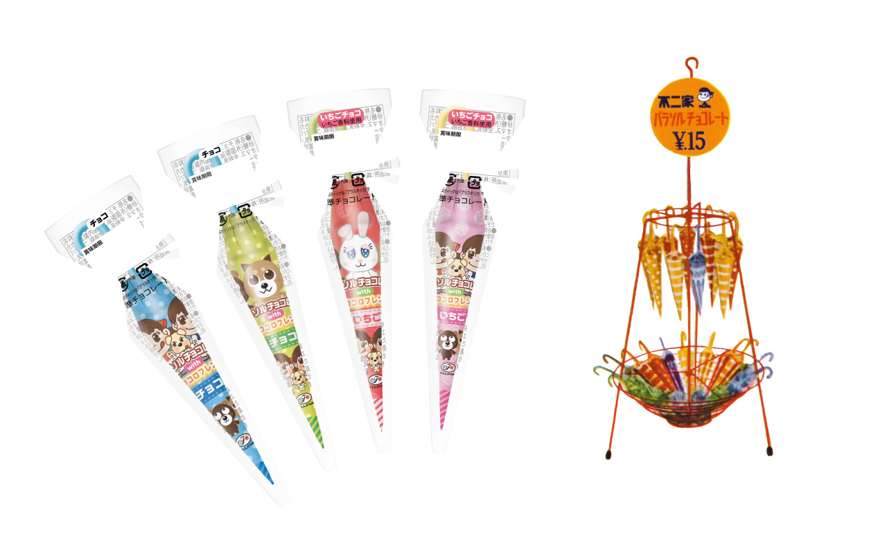 当時、傘の形のチョコレートは斬新でハイカラだった。持ち手となる柄があるので、外出先でも手を汚さずに食べられる利便性も。包装紙をはがすときは尖った先端が折れないように慎重になったという思い出を持つ人も。バレンタインデーが流行しだした1970年代には、ちょっとおしゃれな義理チョコの定番として活躍したという。