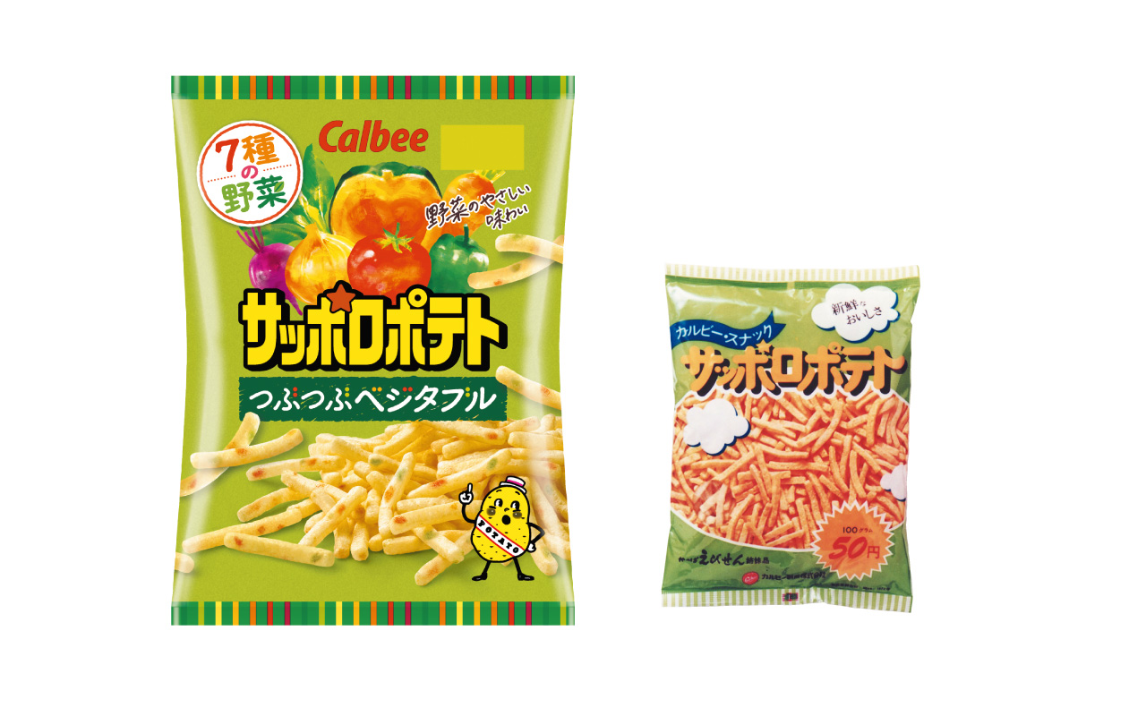 カルビーの創業精神「未利用の食糧資源を活用する」の下、未利用だった加工用じゃがいもを使用。昭和56(1981)年、「食べる野菜ジュース」のキャッチコピーで野菜入りに。「サッポロ」は、じゃがいもの一大産地・北海道と、発売年に冬季競技の世界大会が札幌で開催されたことに由来する。