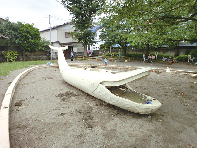 それは川崎市多摩区にある「稲田公園」です。JR南武線稲田堤駅から歩いて10分ほど、ココは別名「クジラ公園」とも呼ばれている所。その名の通りクジラの遊具があるからなんです。遊具広場の砂の海に浮かぶコンクリート製のクジラ。なんでもシロナガスクジラがモチーフになっているんだとか。パックリと大きな口を開けて迫力があります。で、よく見てみるとクジラの背中がくぼんでいて、座れるようにもなっている。イルカに乗った少年ならぬクジラに乗った少年ごっこ遊びができますね。ほかにも砂場の周辺には複合遊具もあり、子どもたちの遊び場になっていました。こんな、砂の海に浮かぶクジラを絵の題材になんてどうですか?