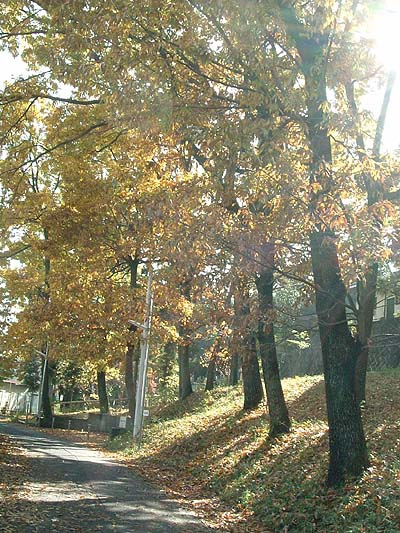 通りから階段を上り、菅馬場の住宅街へ。道路わきの花壇には菊やコスモスがどこまでも植えられ、秋の盛りにはきっと見事だったことでしょう。菅馬場公園への通りに出て、目の前に広がったのは、鮮やかな黄金のコブシ並木(3)。近所の人がほうきで落ち葉を掃き集めています。公園の角を曲がると、ハナミズキ並木(4)。こちらはもうすでに葉っぱが1枚もありません。